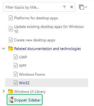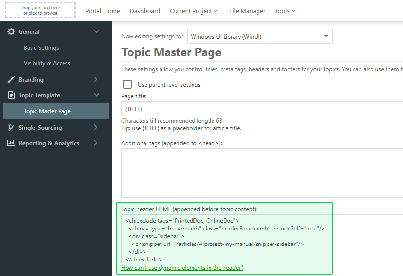 This can be either global Topic Master Page specified in the Portal Settings, or a Project TMS, specified in the Project Settings. Copy the below code to the Clipboard. You will need to change the snippet URL to a URL of a sidebar topic you've created earlier.