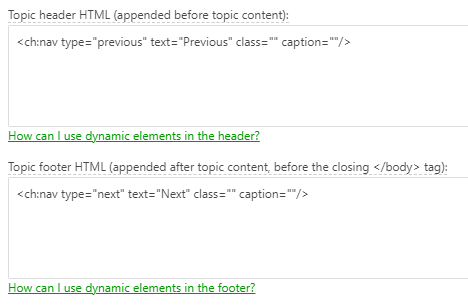 <ch:nav type="previous" text="Previous" class="" caption=""/>Tip You can get the markup you need by inserting the navigation elements into the topic's body, configuring them to your liking, and then switching to the Source View mode to get the code. - Click Save Changes.