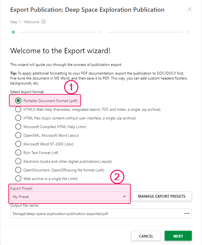 - Select the PDF format an choose Export Preset.
